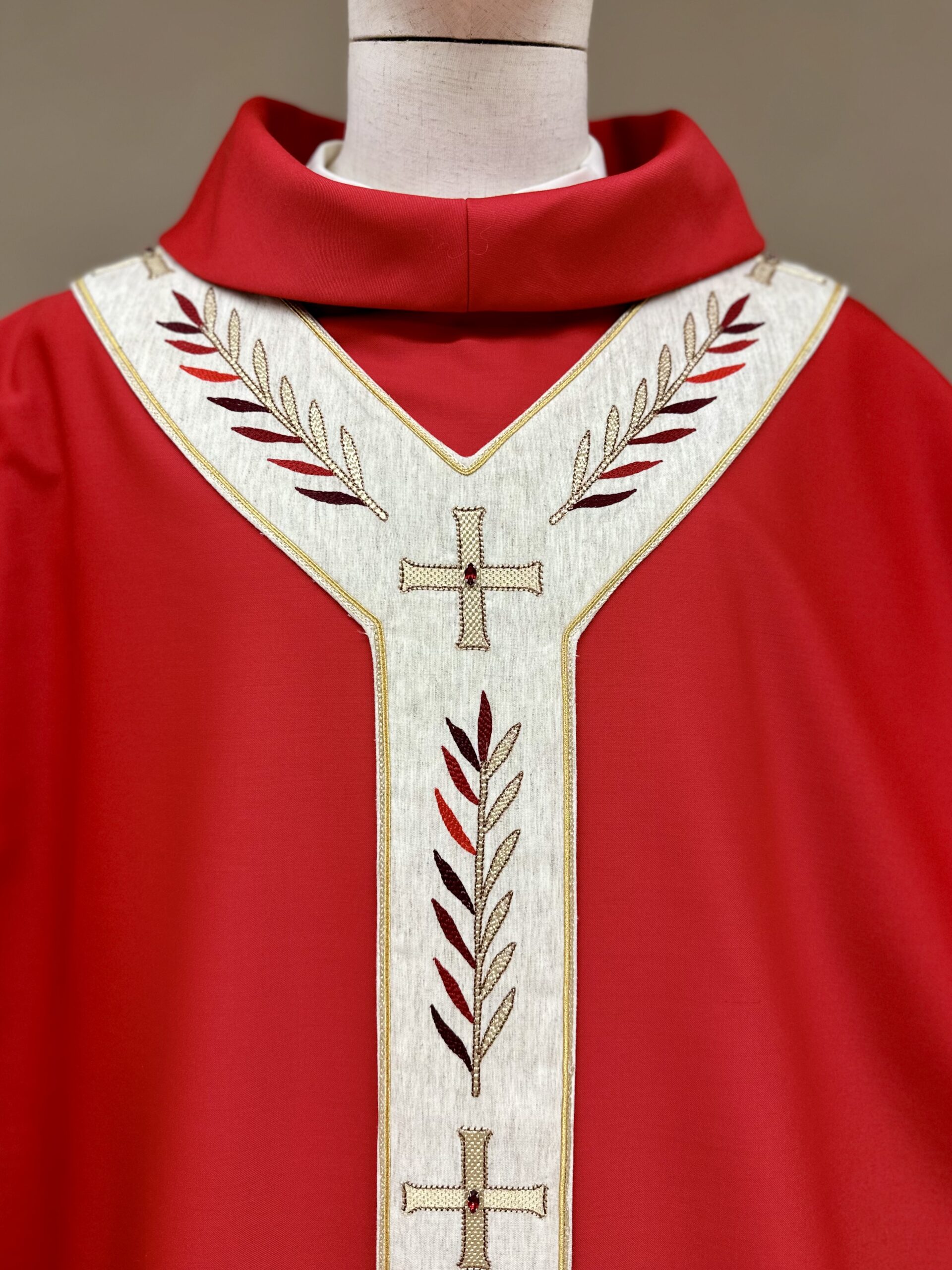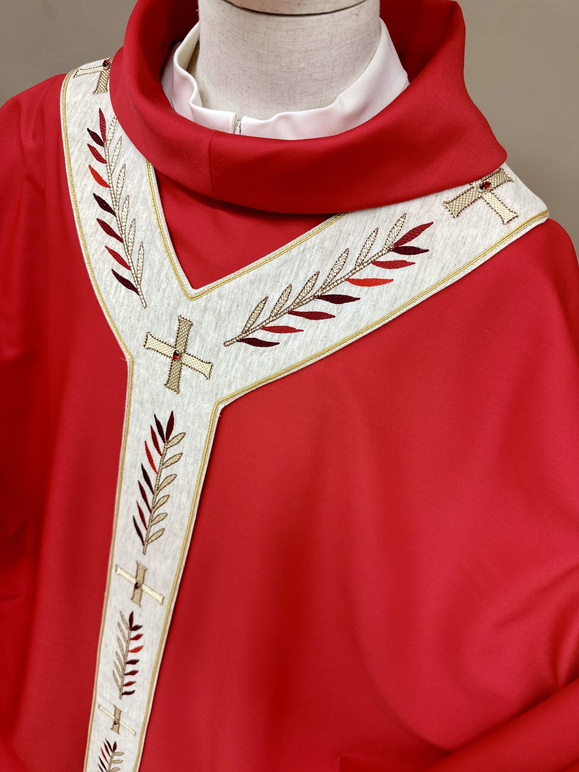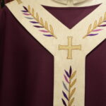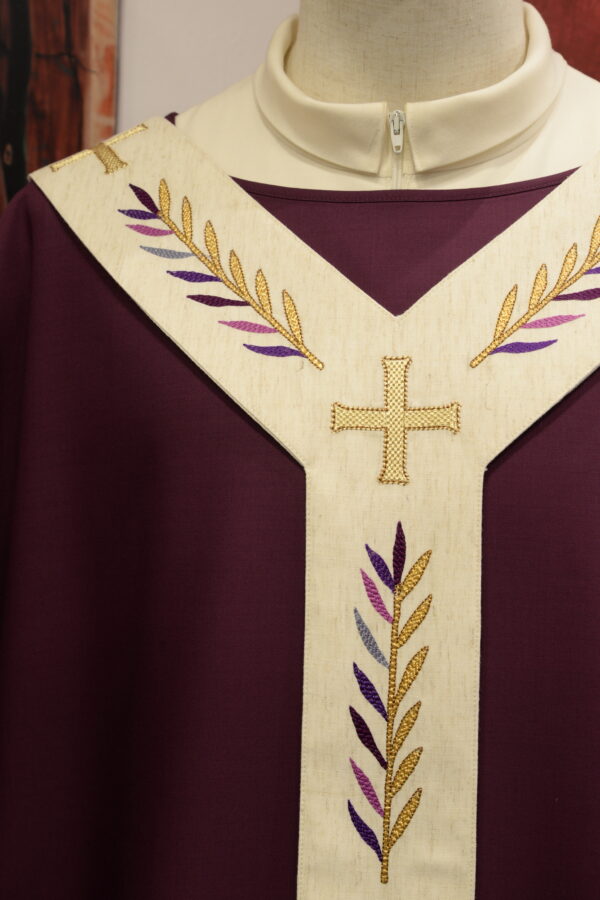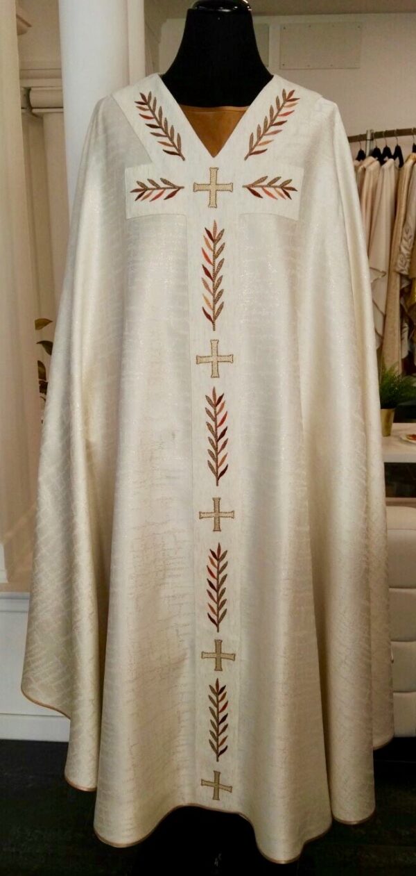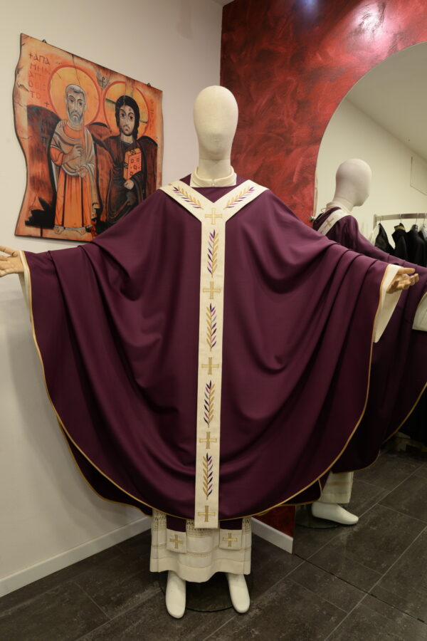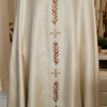 Casula confezionata in tessuto “Retinato” misto lana e seta, applicazione stolino in tessuto misto lino greggio ricamato in toni di oro e policromia.