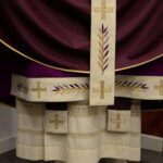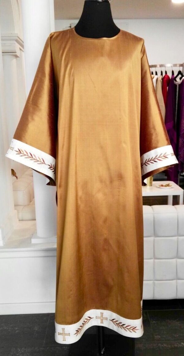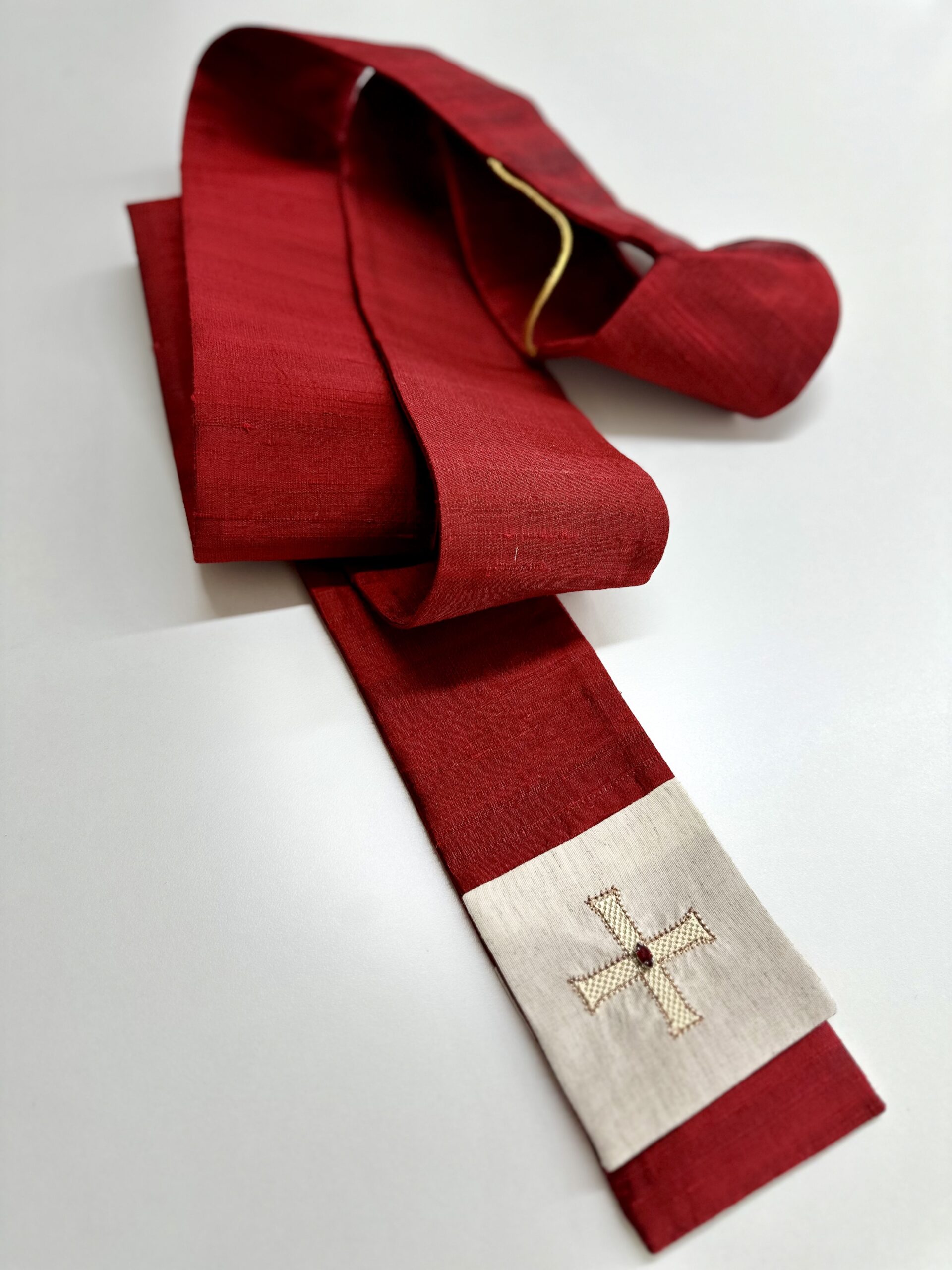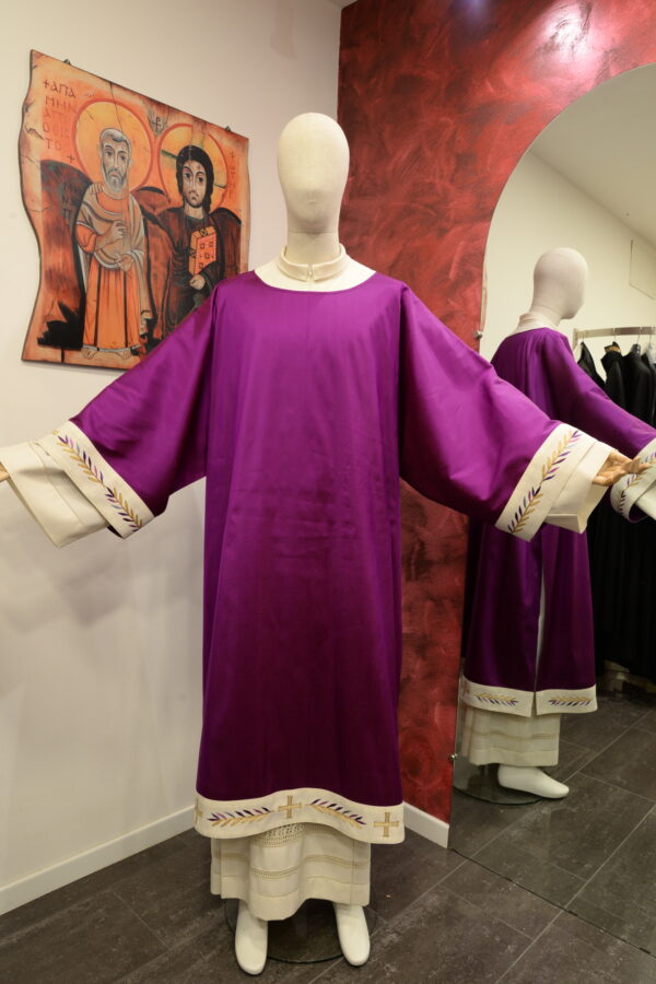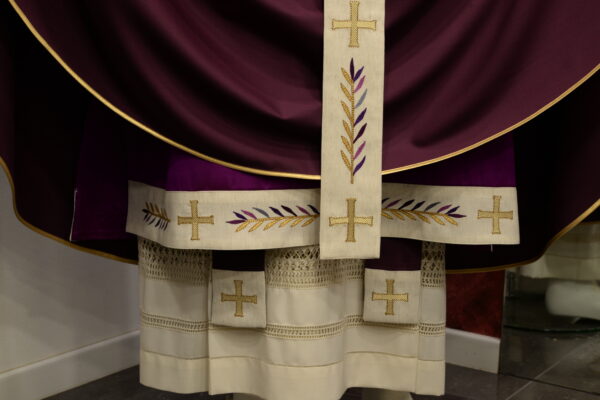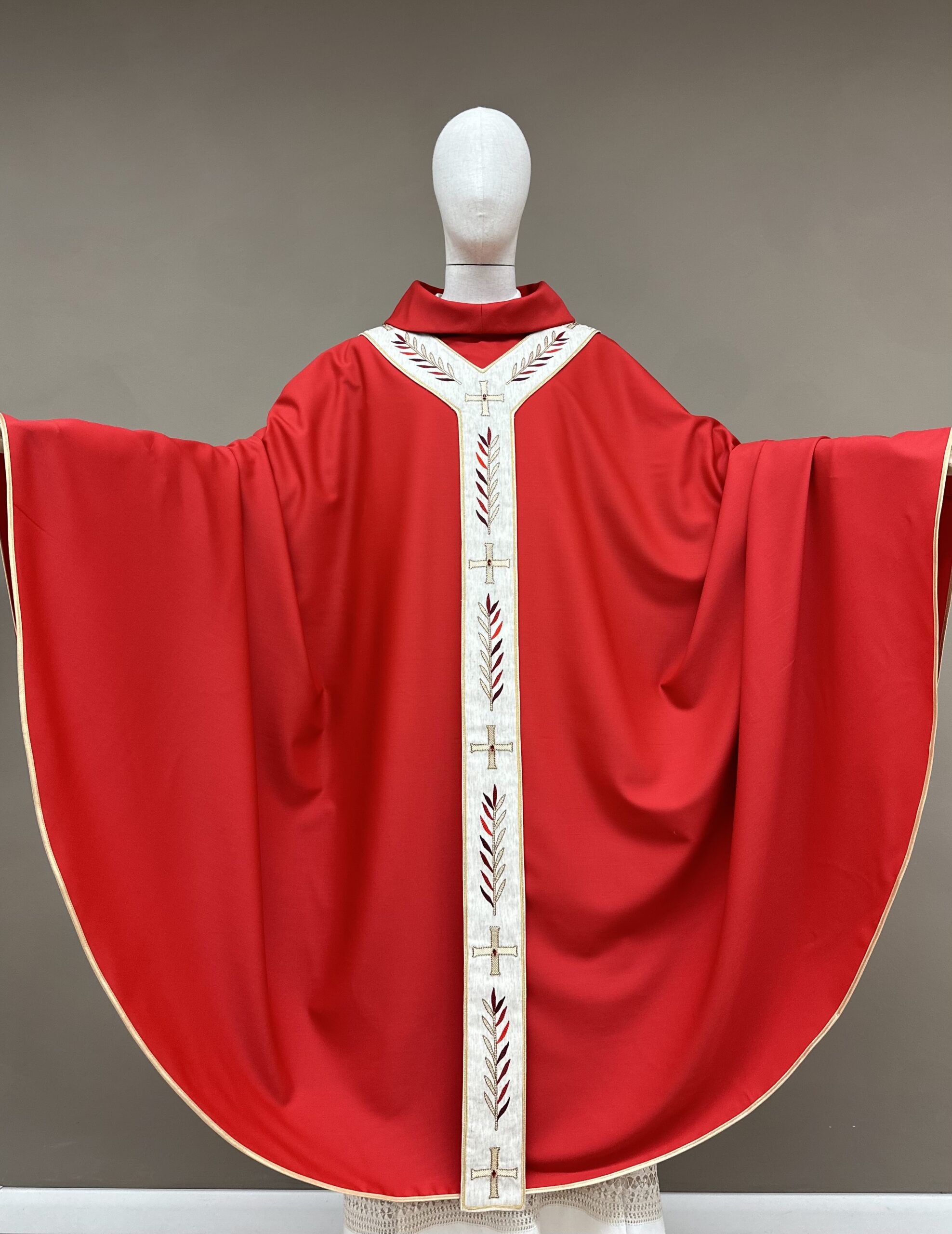Casula confezionata in tessuto “Retinato” misto lana e seta, applicazione stolino in tessuto misto lino greggio ricamato in toni di oro e policromia.