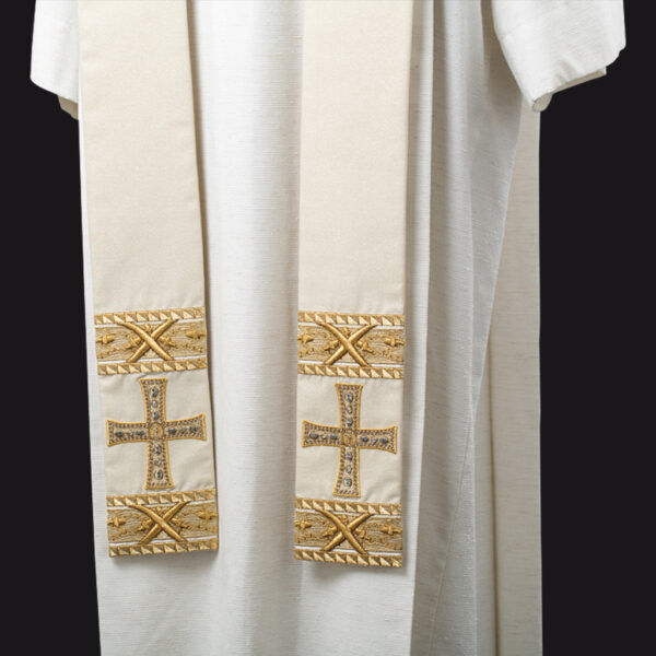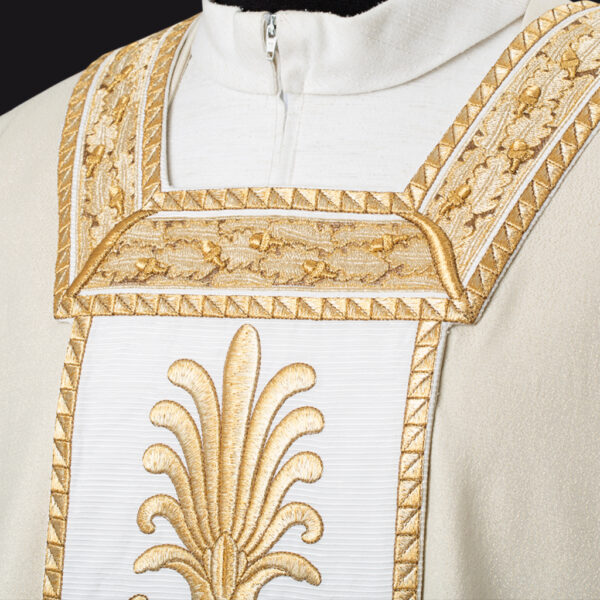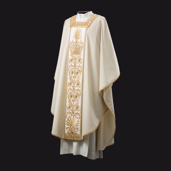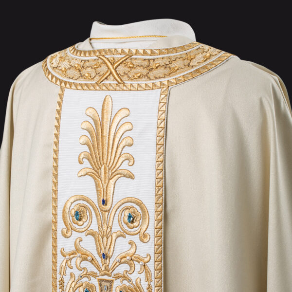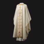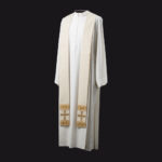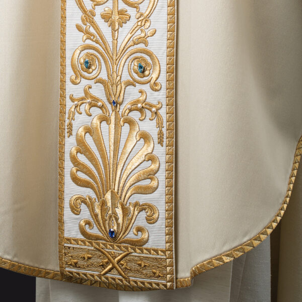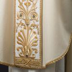 Taglio Paleoc. e collo quadro. Ricamo nell’intero perimetro del manto. Stola presbiterale in coordinato.