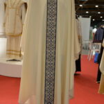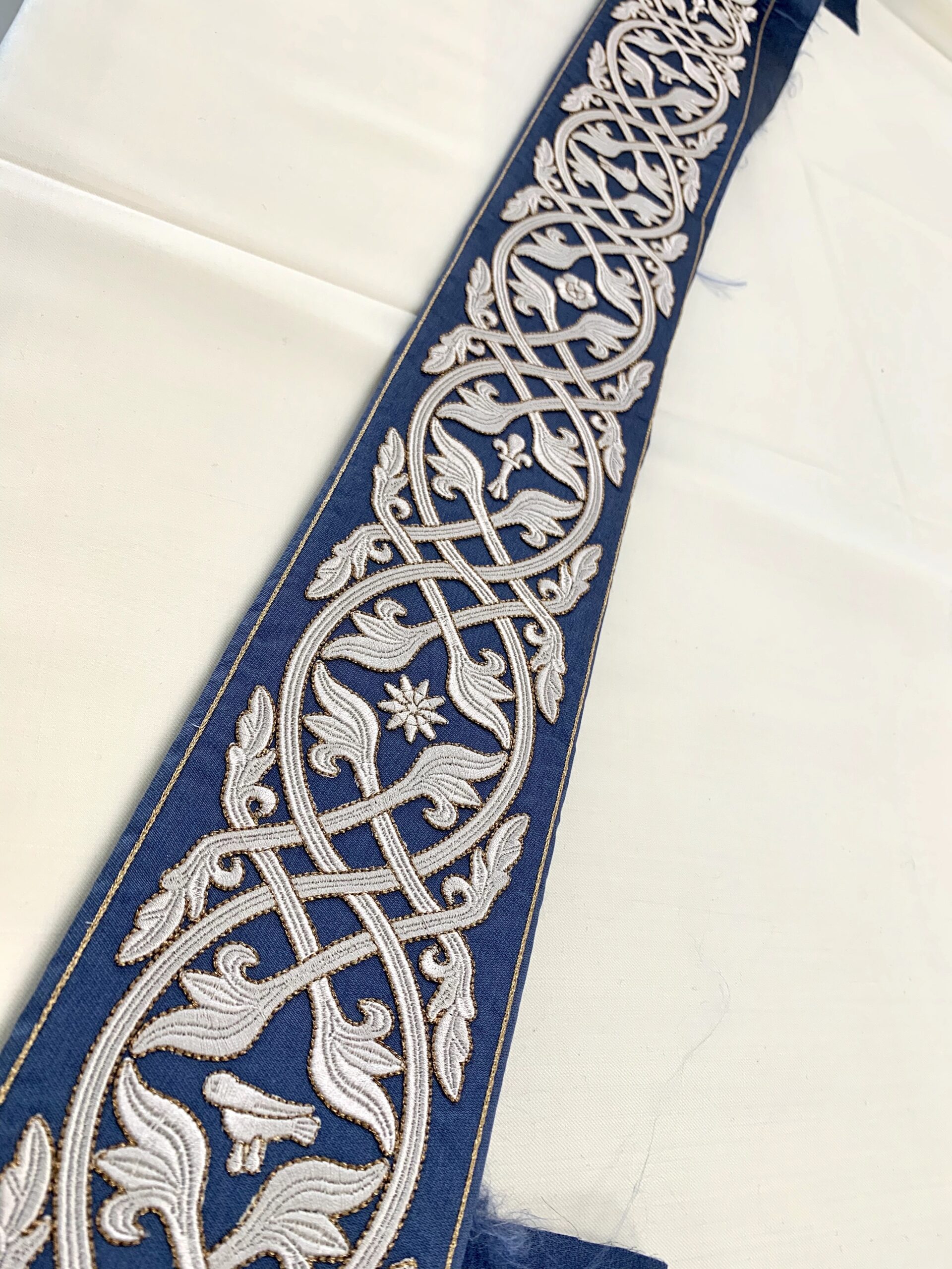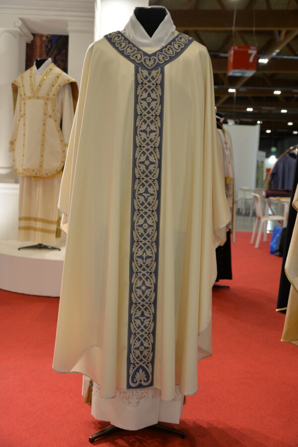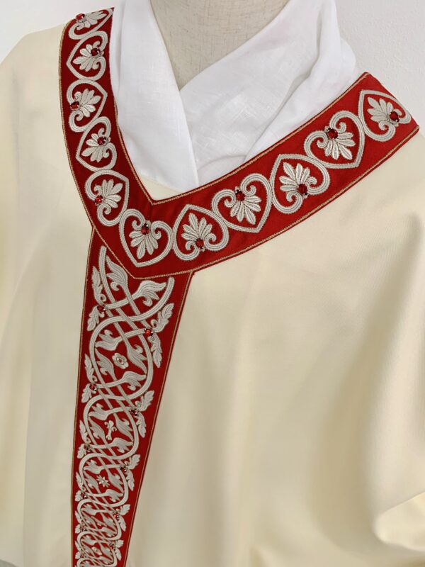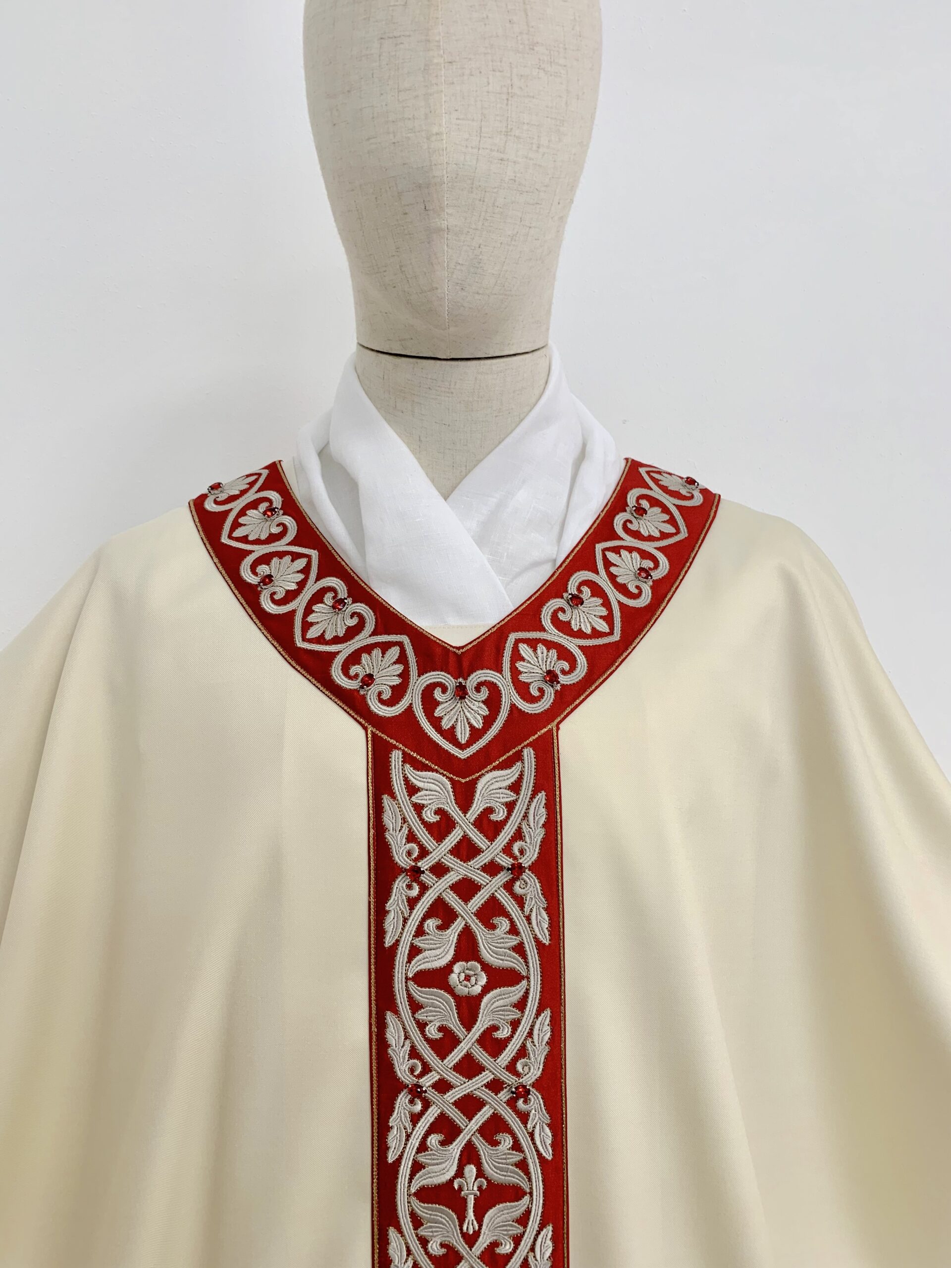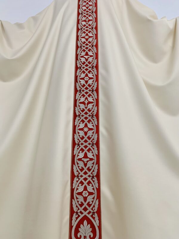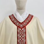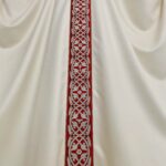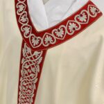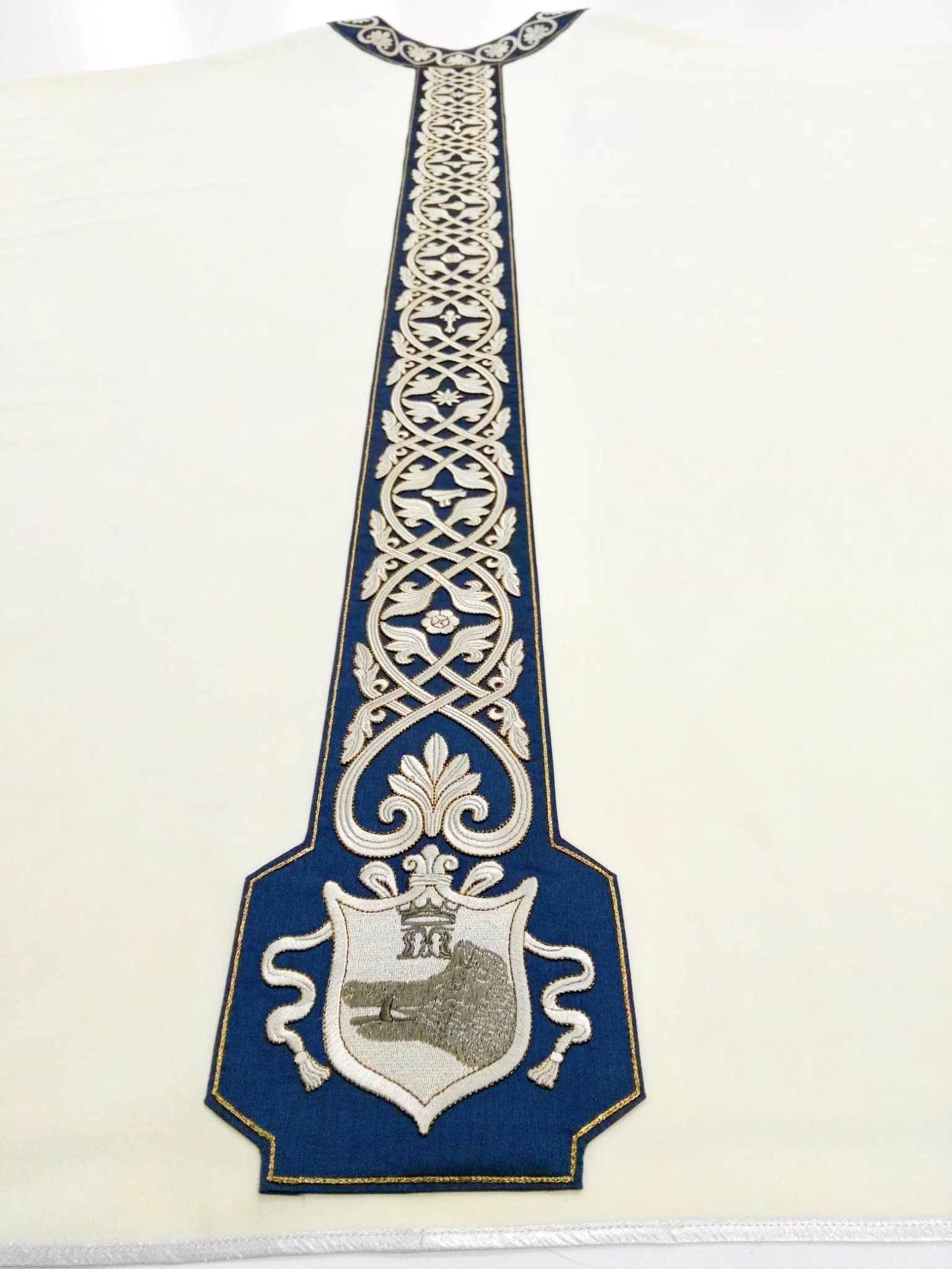 Collezione realizzata riprendendo uno dei disegni inferiori all’arco centrale della Cattedrale romanica di Barletta. Ricamo su pura seta e manto in 100% lana. Personalizzabile.