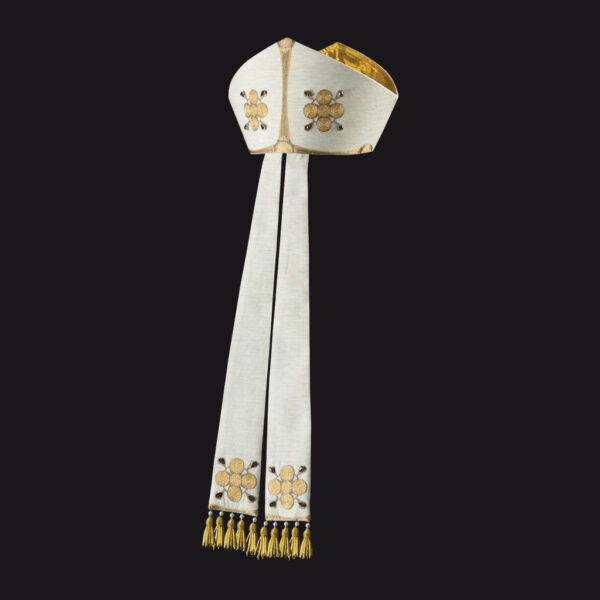 Mitria ricamata in toni oro su tessuto di lana e lino greggio. Applicazione cristalli Swarovski Elements.