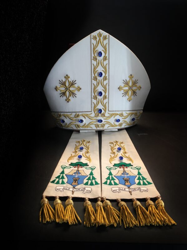 Mitria realizzata su pura seta moiré avorio, ricamo in toni di oro e applicazione cristalli Swarovski Elements Zaffiro. Personalizzabile.