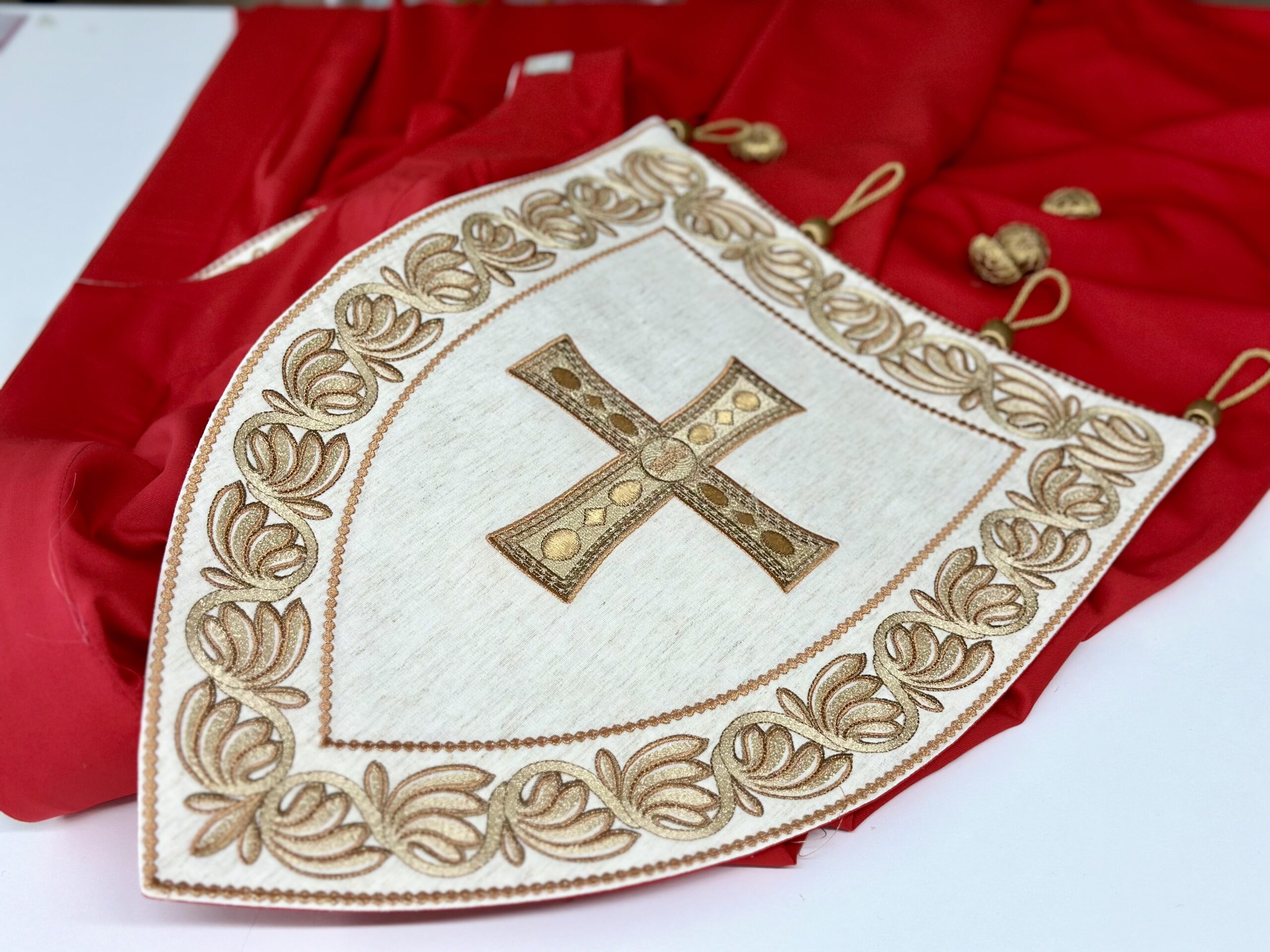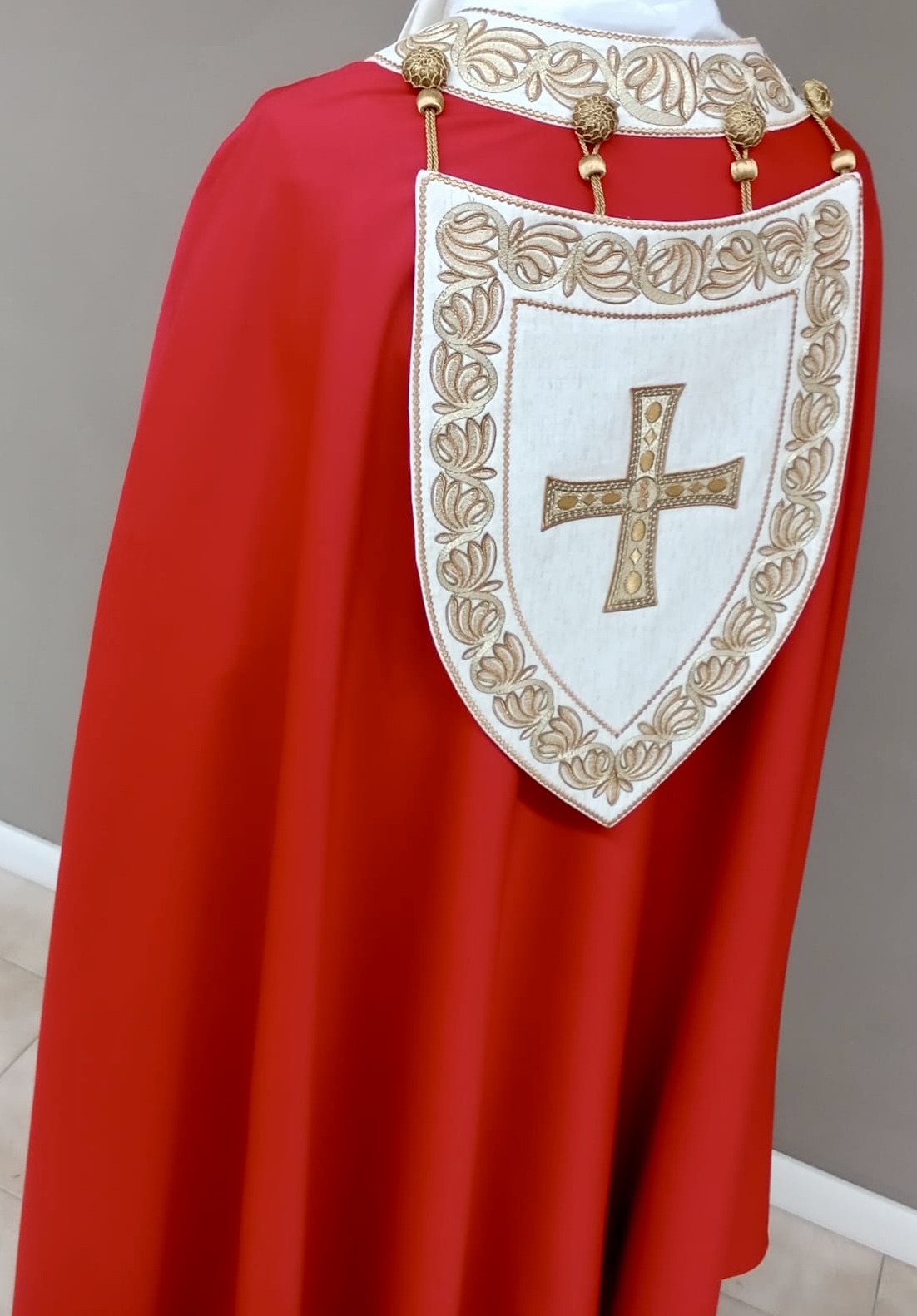 Piviale dell’omonima collezione. Ricamo su tessuto greggio misto lino e manto di foggia ampia.